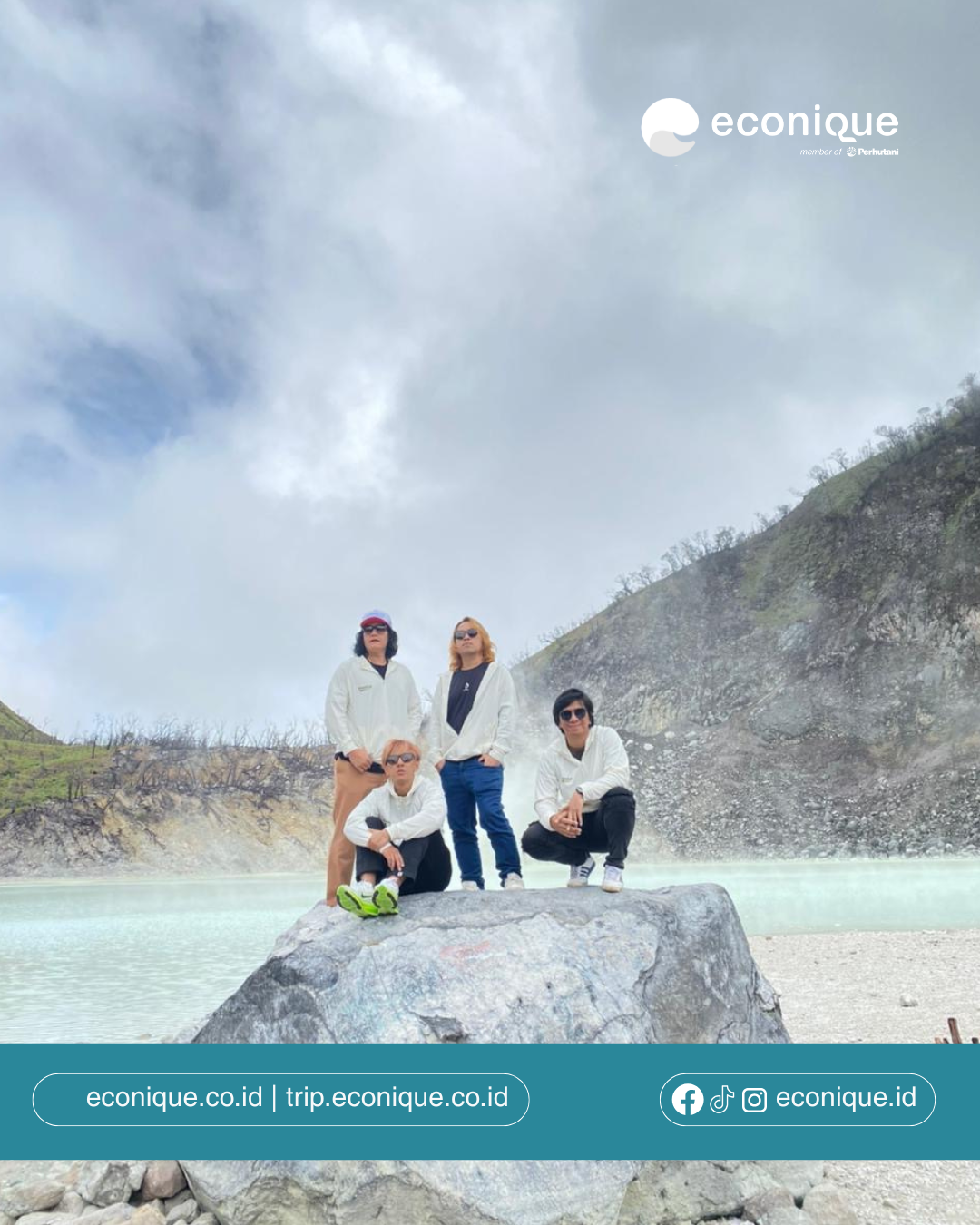 Rombongan tiba di Kawah Putih sekitar pukul 08.00 WIB. Cuaca cerah—momen yang sering menjadi keberuntungan tersendiri di kawasan berkabut—dimanfaatkan secara maksimal oleh panitia Econique. Peserta diarahkan langsung masuk ke area kawah agar mendapatkan pengalaman terbaik sebelum cuaca berubah. Keputusan ini membuat welcome drink dialihkan menjadi farewell drink, tanpa mengurangi kualitas pelayanan.